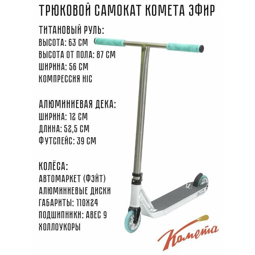 Трюковой самокат двухколесный / парк Комета Эфир, титановый руль (серый, бирюзовый)