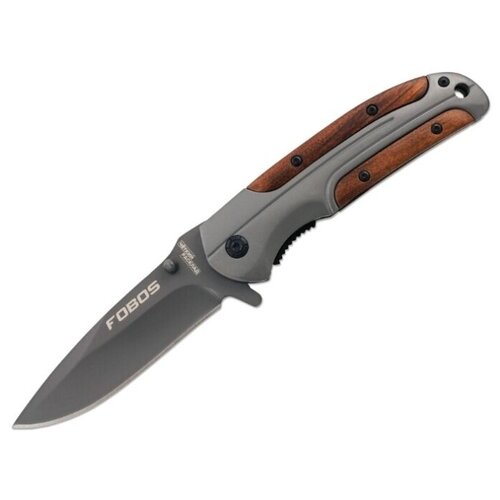 темный, серыйПолностью металлический складной нож с автоматическим боковым извлечением клинка. Его крупный клинок силуэта drop point изготовлен из стали, легированной хромом. Этот элемент обеспечивает надежную защиту металла от воздействия влаги и коррозии. Высокие спуски лезвия образуют острую режущую кромку. Фальшлезвие на обухе несколько снижает общую массу, не ослабляя функциональный кончик. Рукоять состоит из двух металлических плашек, поверхность которых дополнена небольшими рельефными углублениями. В сложенном состоянии клинок удерживается замком liner lock, а в рабочее положение приводится с помощью флиппера-плавника.