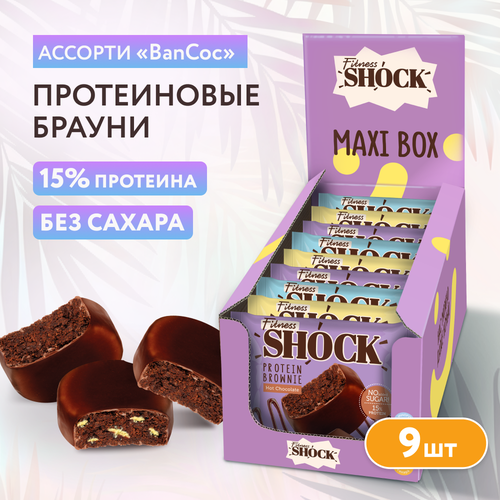 Протеиновое печенье без сахара брауни FitnesSHOCK Ассорти «BanCoc», 3 вкуса, 50гр, 9 шт