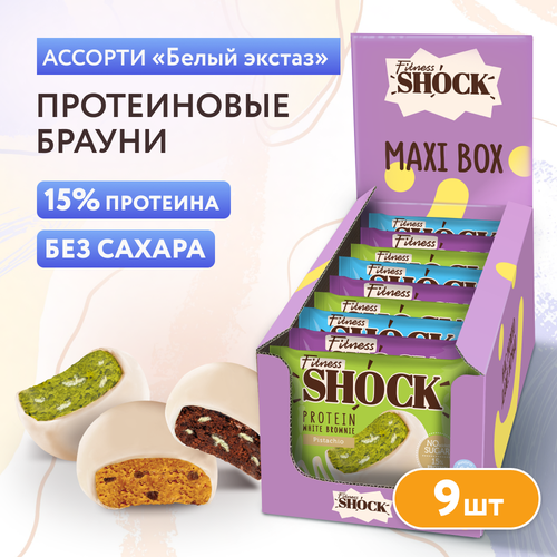 Протеиновое печенье без сахара брауни FitnesSHOCK Ассорти «Белый экстаз», 3 вкуса, 50гр, 9 шт