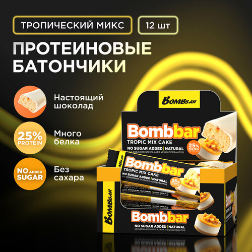 Bombbar Протеиновые батончики в шоколаде без сахара "Торт тропический микс", 12шт х 40г
