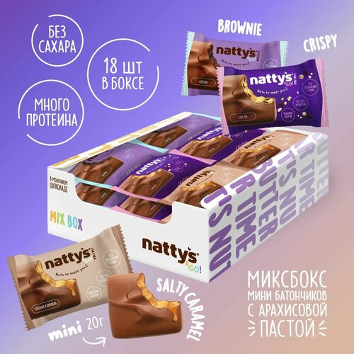 Протеиновые мини-батончики без сахара Nattys&Go! Mini Mix Brownie, Crispy, Salty Caramel, 18 шт по 20 гр