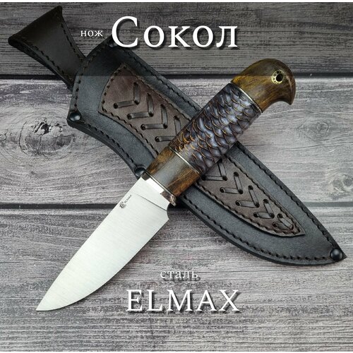 Нож Сокол сталь ELMAX рукоять карельская берёза, вставка шишка в акриле, ножны из натуральной кожи, Кузница Семина официальный производитель