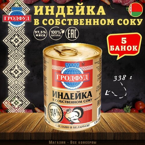 Мясо индейки в собственном соку по белорусски, Гродфуд, 5 шт. по 338 г