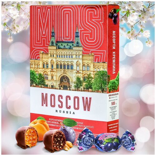 Конфеты ассорти Фрукты и орехи шоколадные Кремлина в коробке Москва Красная, 500 гр.