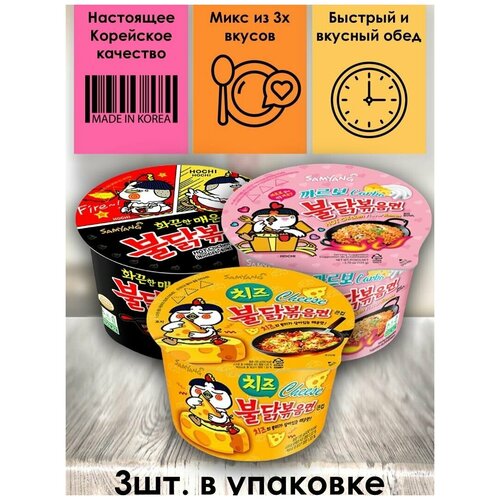 SamYang/Самьянг Лапша быстрого приготовления, Корея, микс 3 вкуса (Хот Чикен Чиз, Карбонара, Хот Чикен)