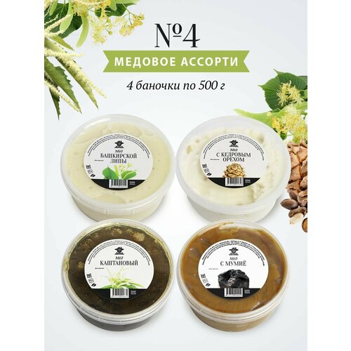 Медовое ассорти №4, 4 банки по 500 г, подарочный набор меда
