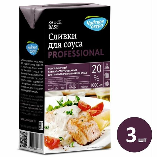 Профессиональные сливки для соуса Чудское озеро, 20%, 3 шт по 1000 мл