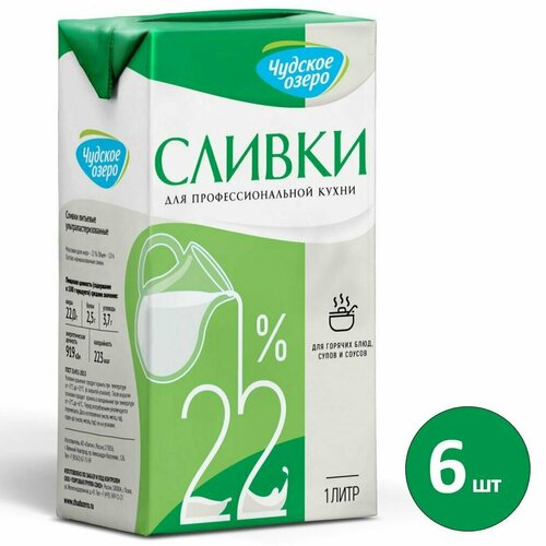 Профессиональные сливки для кулинарии Чудское озеро 22%, 6 шт по 1000 мл