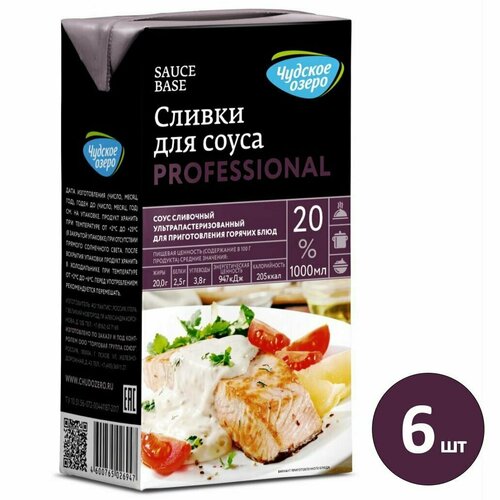 Профессиональные сливки для соуса Чудское озеро (натуральный готовый сливочный соус), 20%, 6 шт по 1000мл