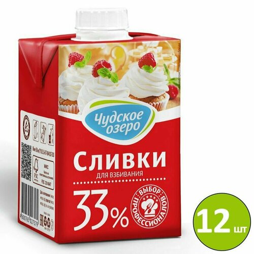 Натуральные сливки для взбивания Чудское озеро 33%, 12 шт по 500 мл