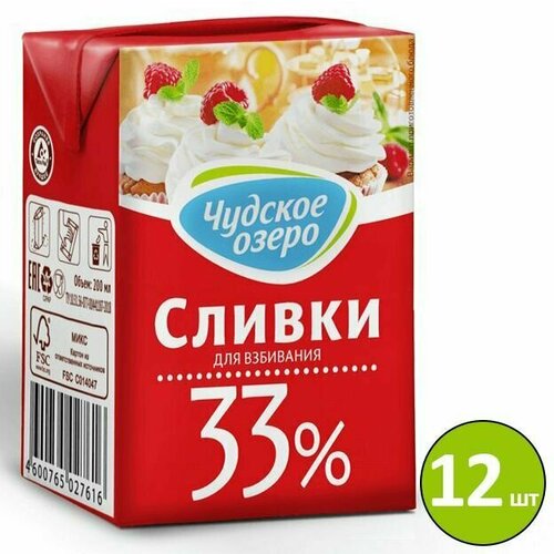 Натуральные сливки для взбивания Чудское озеро 33%, 12 шт по 200 мл