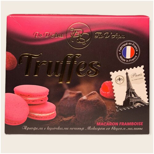 Трюфели с кусочками печенья Макарон со вкусом малины. Знаменитые представители кондитерского мастерства Франции, какао-трюфели и малиновые печенья-макарон, сошлись для создания уникальной современной комбинации. Мягкий плавящийся трюфель с хрустящей крошкой миндального печенья подарит Вам больше, чем просто момент наслаждения!