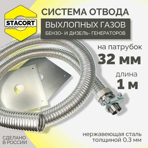 На патрубок 32 мм, длина 1 м. Система отвода выхлопных газов генератора совг на выхлопной патрубок с наружным диаметром до 32 мм, длина 1 м.