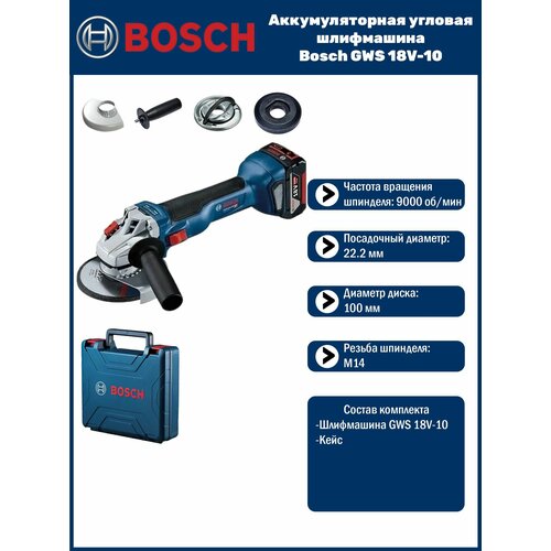Аккумуляторная угловая шлифмашина Bosch GWS 18V-10 (без АКБ и ЗУ в кейсе)