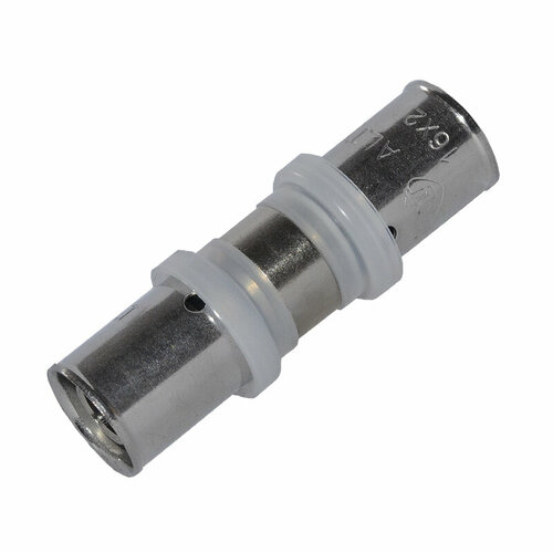 Муфта используется для соединения металлопластиковых труб одинакового диаметра. Труба закрепляется на фитинге с помощью обжимного разрезного латунного кольца, которое обжимает трубу при взаимодействии конусных поверхностей гайки и кольца.