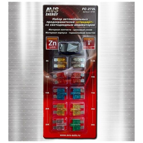 Набор предохранителей со светодиодом AVS FC-272L "стандарт" в блистере + пинцет (5А, 7,5А, 10А, 15А, 20А, 25А, 30А) автомобильные- 43736