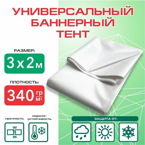 Тент из литой баннерной плотной белой ткани, размером 3х3 м (точные размеры 2х3,2м). Плотность 440 гр/м2, обеспечивает повышенную прочность И долгую эксплуатацию! Срок службы составляет от 2 до 7 лет.