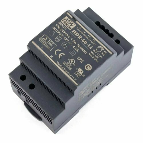 Блок питания модульный на DIN рейку 12в, 5а, 52.5*90*54.5мм, Mean Well HDR-60-12