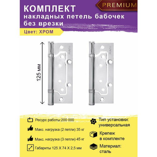 Дверные петли накладные PUNTO (Пунто) бабочки (без врезки) цвет хром для межкомнатных дверей комплект 2 шт (универсальные навесы 125 мм)