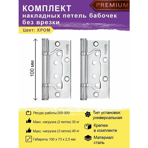 Дверные петли накладные PUNTO (Пунто) бабочки (без врезки) цвет хром для межкомнатных дверей комплект 2 шт (универсальные навесы 100 мм)