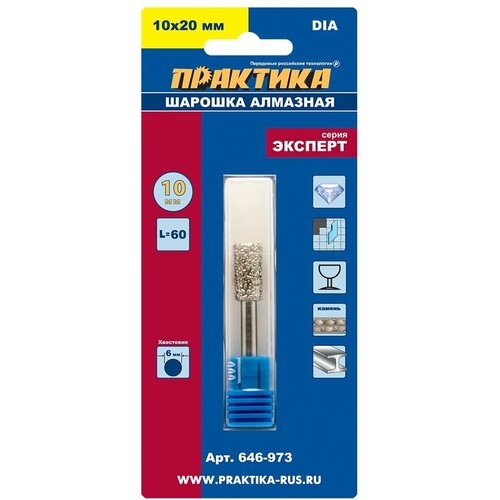 Шарошка алмазная ПРАКТИКА цилиндрическая 10х20 мм, хвост 6 мм, (646-973)