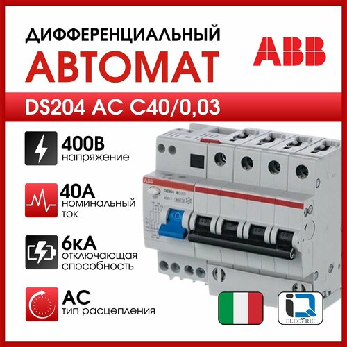 Автоматический выключатель дифференциального тока DS204 AC C40/0,03 ABB 2CSR254001R1404