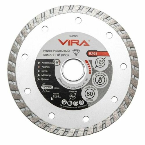 Диск алмазный отрезной TURBO по сухому резу марки тундра предназначен для работ с угловой шлифовальной машиной. Диск применяется для сухого реза большинства строительных материалов. Инструмент имеет режущую кромку TURBO, благодаря которой диск обеспечивает чистый и быстрый рез твёрдых материалов, а также быстро охлаждается обеспечивая быструю и качественную работу. Алмазное напыление служит для чёткой, аккуратной и тонкой резки, не оставляя сколов и дефектов от перегрева.