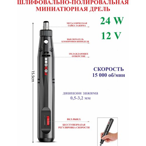 Электрическая шлифовальная миниатюрная дрель, 12 V, зажим от 0,5 до 3,2 мм, 15000 об./мин.