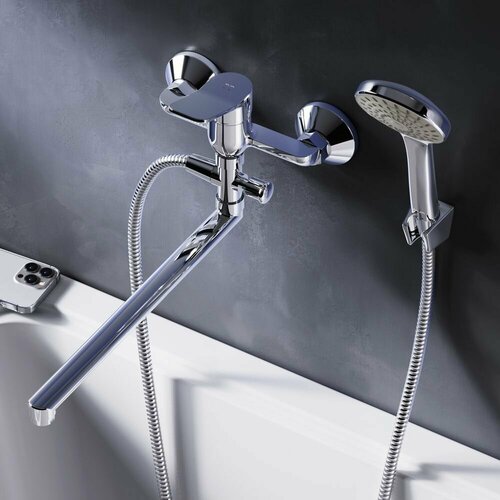 Смеситель для ванны AM.PM X-Joy F85A90100 хром, поворотный излив 350 мм, душевой набор в комплекте, керамический картридж, покрытие High Gloss, латунь