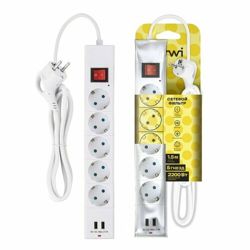 Сетевой фильтр düwi, 5 розеток, 1.5 м, 10 А, ПВС 3х0.75 мм2, с з/к, 2USB, со шторками