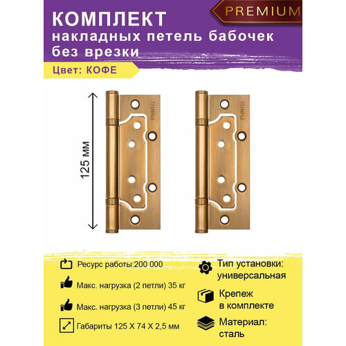 Дверные петли накладные PUNTO (Пунто) бабочки (без врезки) цвет кофе глянец для межкомнатных дверей комплект 2 шт (универсальные навесы 125 мм)