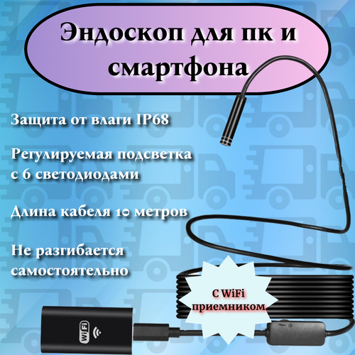Камера - эндоскоп + WiFi приёмникС твердым кабелем, влагозащитой, набором зеркал, крючками, разрешением камеры 1600х1200 и встроенным светодиодным фонариком.