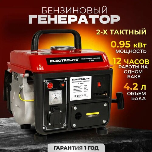 Генератор бензиновый Electrolite G 1000 ( 1.2 кВа макс. нагрузка , 220 В / 12 В, 0.7 / 0.95 кВт, 50 Гц, 2.5 л. с, 2 тактный двигатель )