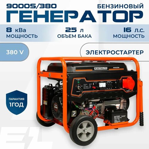 Генератор бензиновый Электрический Electrolite 9000S/380 ( 11.25 кВа пиковая нагрузка , 380 В / 12 В, 7 / 8 кВт, 50 Гц, 16 л. с, электростартер + АКБ )