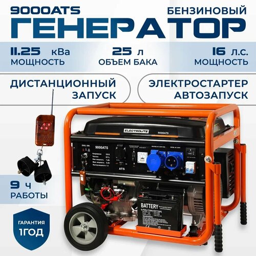 Генератор бензиновый ELECTROLITE 9000 ATS ( электростартер, Автозапуск 16 л. с 8 кВт макс, 7 кВт номинал, 220 В, бак 25 Л, медь )