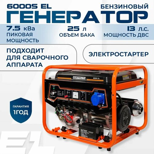 Генератор бензиновый / электростанция / бензогенератор Electrolite 6000S EL медная обмотка ( 7.5 кВа пиковая нагрузка , 220 В / 12 В, 5 / 6 кВт, 50 Гц, 13 л. с, электростартер + АКБ ) генератор 5 кВт
