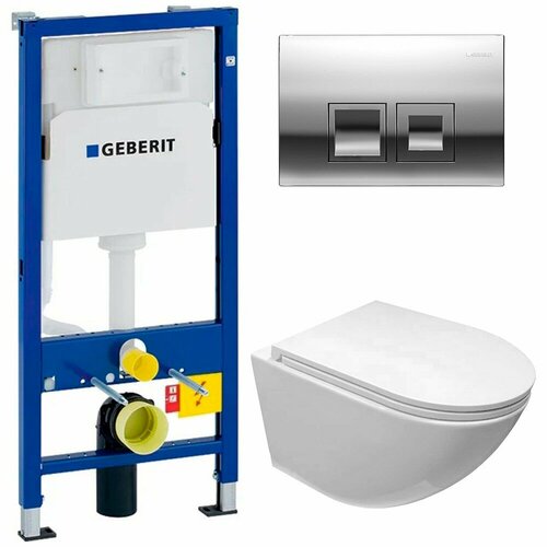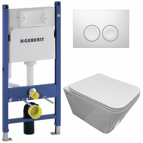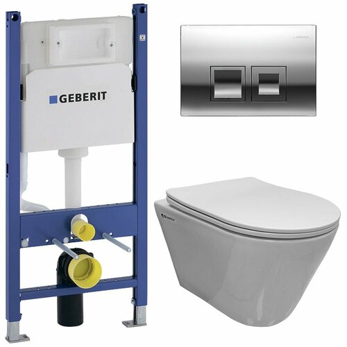 Комплект: - инсталляция Geberit Duofix 458.125.21.1: - рама монтажная со смывным бачком и соединительным комплектом Geberit Duofix 111.153.00.1 - кнопка смыва Geberit Delta 51 115.105.21.1 пластик, хром глянец - комплект креплений Geberit - унитаз подвесной безободковый Fubini FB002 с сиденьем