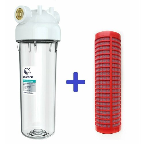 Корпус фильтра KSBP 1/2" 10" Slim Line для холодной воды прозрачный + картридж механической очистки из нержавеющей сетки 10SL, многоразовый, 50 мкм