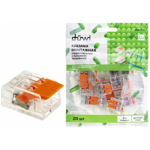 Клеммы соединительные монтажные с рычажком duwi СМК 223-412 2-проводные 4 кв. мм прозрачные 20 шт 26673 0