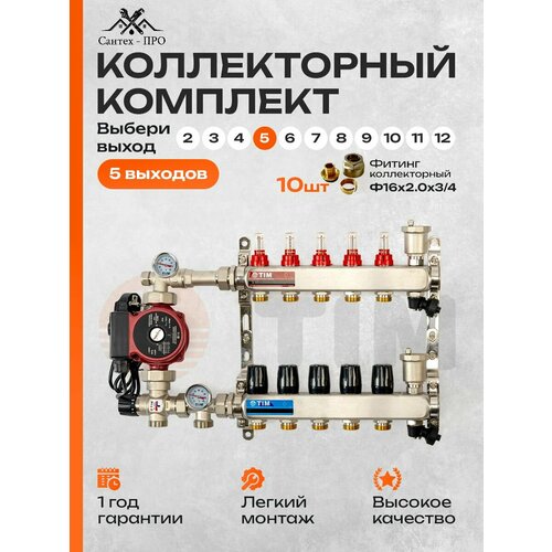 Коллектор для теплого пола на 5 контуров с насосом 25/6, смесительным узлом 1035 и евроконусами, до 70 кв/м