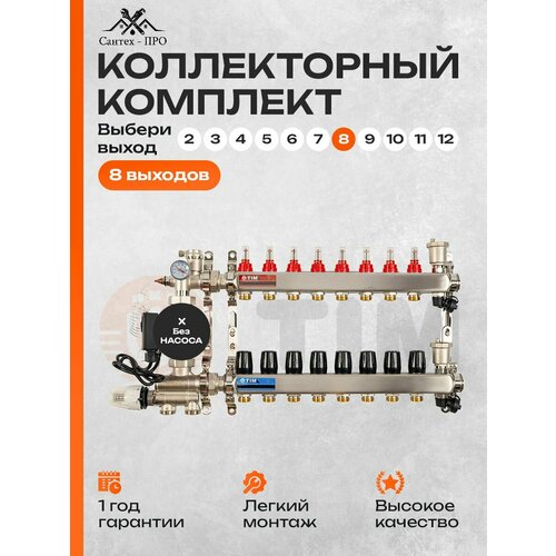 Коллектор для теплого пола на 8 контуров c смесительным узлом от 20-60С до 100 кв/м(без насоса)