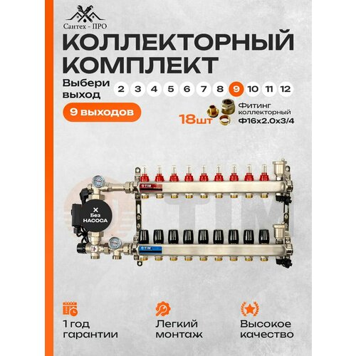 Коллектор для теплого пола на 9 контуров c смесительным узлом 1035 и евроконусами до 110 кв/м(без насоса)