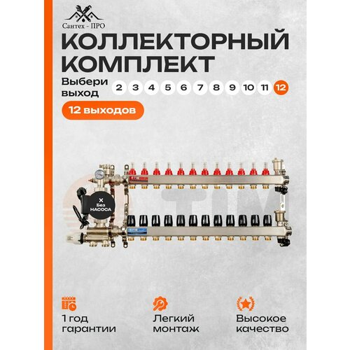 Коллектор для теплого пола на 12 контуров c смесительным узлом от 20-60С до 140 кв/м(без насоса)