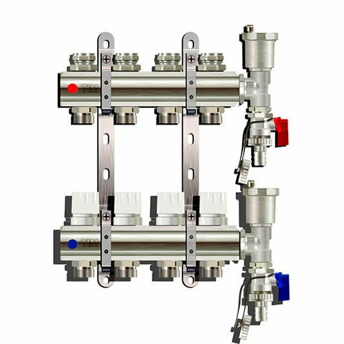 нерж. стальКоллектор c расходомером используются в системах водяного напольного отопления для распределения и регулирования рабочей среды в системе. Коллекторные блоки из нержавеющей стали служат для распределения потока транспортируемой среды по контурам системы напольного отопления, рассчитан на применение в системах водяного отопления с максимальной рабочей температурой 70 °C и давлением до 6 бар включительно. Коллекторная группа объединяет в себе подающий и обратный коллекторы из нержавеющей стали AISI 304, ручные настроечные клапаны с расходомерами (ротаметрами), регулирующие клапаны (с возможностью установки электротермического сервопривода), пробки коллекторов и крепежные кронштейны из оцинкованной стали. В состав блока не входят элементы сервисной группы. Данные коллекторные блоки можно использоваться в системах, где в качестве теплоносителя используется вода либо незамерзающие гликолевые смеси. Число выходов -- от двух до двенадцати. Присоединение трубных петель осуществляется с помощью фитингов 3/4" стандарта