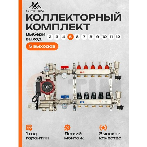 Коллектор для теплого пола на 5 контуров с насосом 25/6, кранами с термометром, смесительным узлом от 20-60С до 70 кв/м