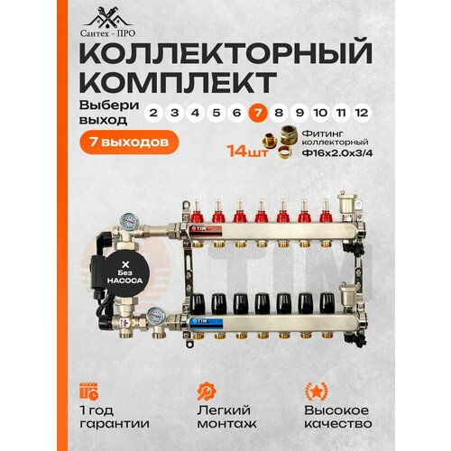 Коллектор для теплого пола на 7 контуров c смесительным узлом от 20-60С до 90 кв/м(без насоса)