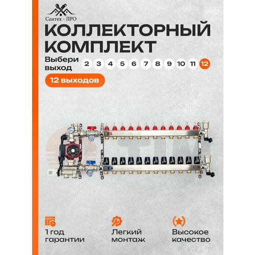 Коллектор для теплого пола на 12 контуров с насосом 25/6, кранами с термометром, смесительным узлом от 20-60С до 140 кв/м