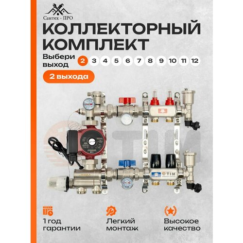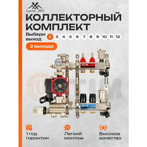 Коллектор для теплого пола на 2 контура с насосом 25/6, кранами с термометром, смесительным узлом от 20-60С до 40 кв/м