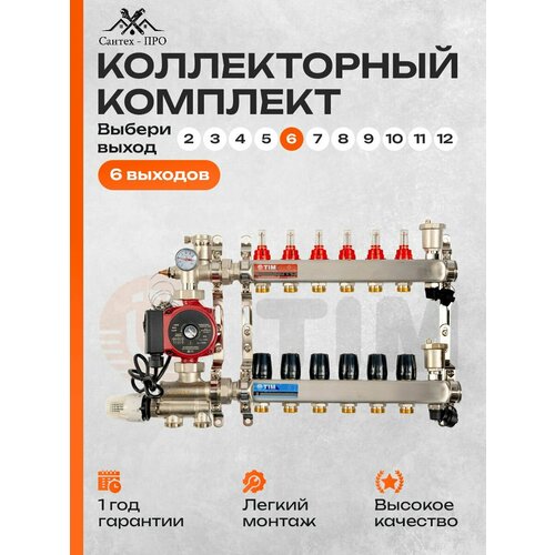 Коллектор для теплого пола на 6 контуров с насосом 25/6, смесительным узлом от 20-60С до 80 кв/м